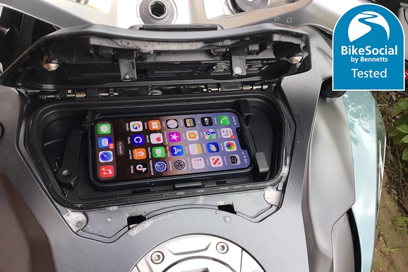 Optional vario panniers expand between 27-33 litres. You can see the difference in the tide mark here. Wireless phone charging allows BMW app to take care of navigation.