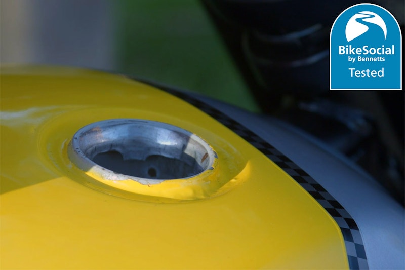 Remove the seat and there’s enough storage under it for a small pack of chewing gum and showing us that there aren’t many layers of paint on the tank (also apparent around the fuel filler, with bits flaking off).