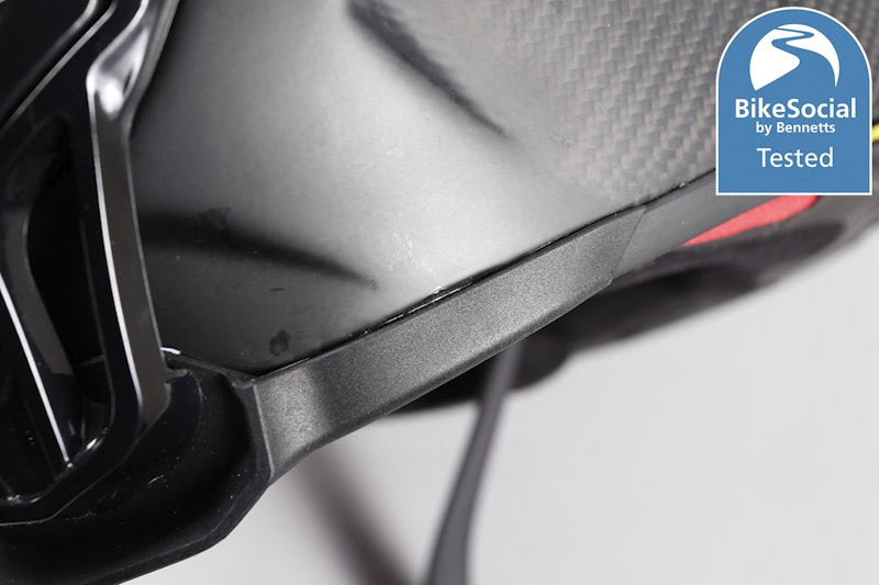 The ‘Ultra Carbon’ shell is a carbon-fibre skin over an aramid/glass fibre resin shell, and while a yellow swing tag on the strap warned that “This helmet features an exclusive manual processing, therefore, any irregularity or cosmetic imperfection are not to be considered a defect, rather the significant characteristic of its uniqueness,” I’m impressed with the excellent lay-up. Some of this plain helmet is painted matte black, which can hide cosmetic irregularities in the carbon-fibre, but it’s actually the small bits of oozing glue that I noticed at a couple of points around the bottom edge of the shell. These aren’t a safety issue, and they’re not glaringly obvious but while relatively good value for a carbon-vibre helmet, this isn’t in the budget end of the market.