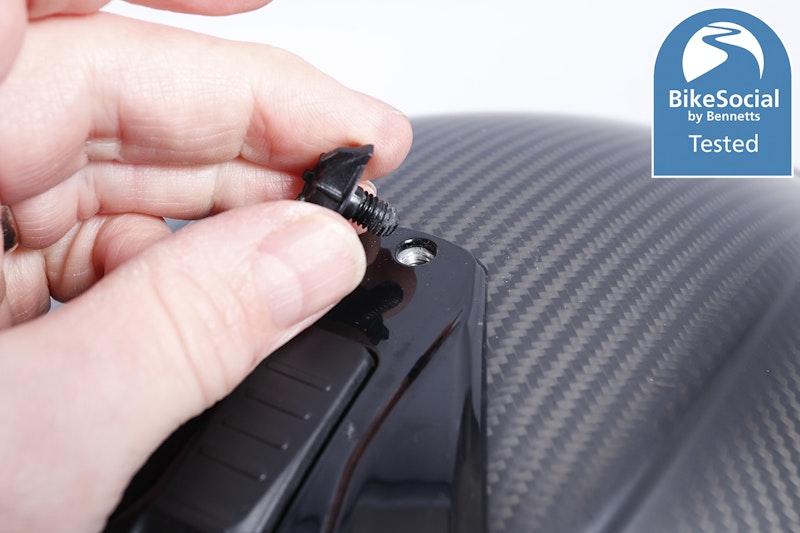 The X-552’s peak is removable by unscrewing the top fastener and rotating to two bayonet fittings at either side, but Nolan doesn’t include any blanking plates for those, which leaves the helmet looking a little untidy and rather cheap. The side fasteners are retained in the peak, but the top screw isn’t. You could screw it back into the helmet, which would probably be fine but it does press into the expanded polystyrene (EPS) inner shell a little. It’s a plastic screw, but it still makes me slightly nervous if there was a direct impact at that point in a crash. Realistically it doesn’t protrude much at all, and there’s a lot of EPS below it.